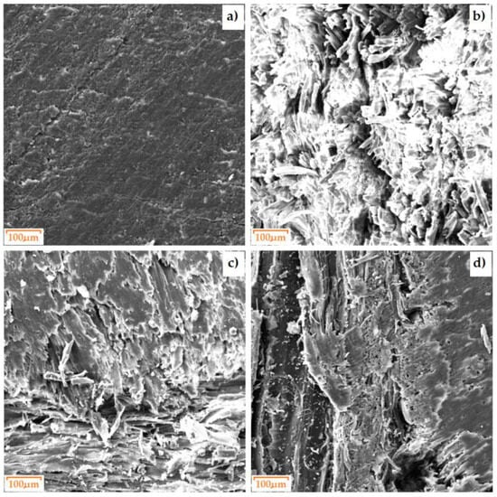 SEM micrographs of the surfaces of the test materials: (a) HPL, (b) MDF, (c) chipboard and (d) plywood board.