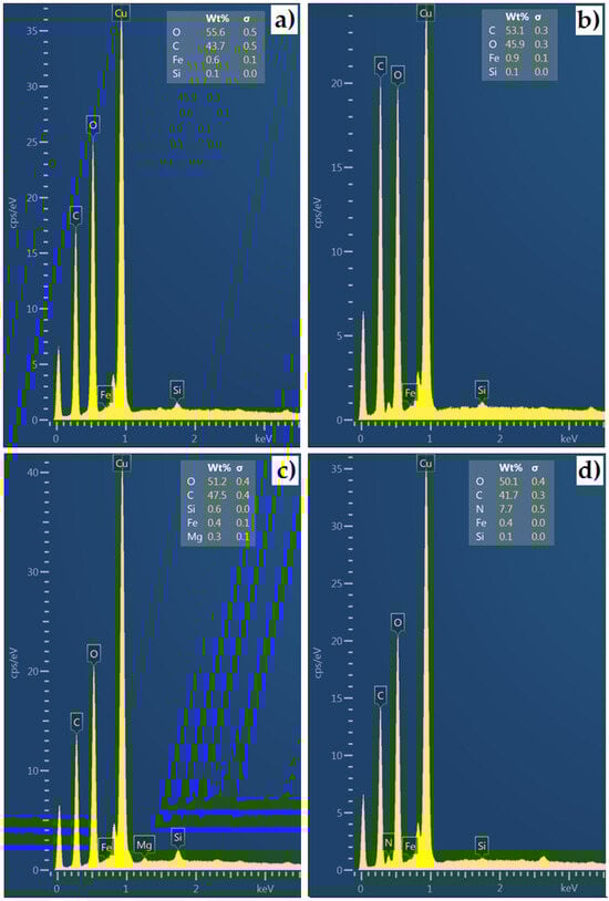 An EDS spectrum of (a) chipboard, (b) MDF, (c) HPL and (d) plywood board.