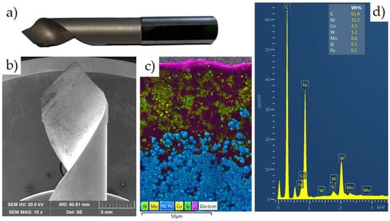 (a) View of the cutting tool, (b) drill at ×10 magnification, (c) element mapping analysis and (d) EDS spectrum.