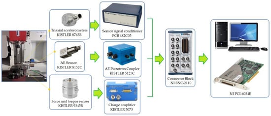The drilling process was carried out on an EMCO® CNC vertical milling machine (EMCO GmbH, Hallein, Austria). A schematic diagram of the configuration of the measurement track and the measurement data archiving system is shown in Figure 7. During the drilling process, acceleration signals in the directions ax, ay and az, thrust force Ft and cutting torque Ms, and an additional acoustic emission signal AERMS were recorded with an integrating constant τ = 0.12 ms.