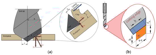Before starting the research, the basic geometry of the drill cutting edge was determined. The drill lip clearance was κr = 45°, which means that sinκr = 0.707. Then, the width of the cutting layer (b) was determined, which was a constant parameter for all the drilling tests: b = ap/sinκr = 4.95 mm. To carry out the tests, it was necessary to calculate the feed per tooth fz and feed rate vf for each cutting layer thickness (Table 3).