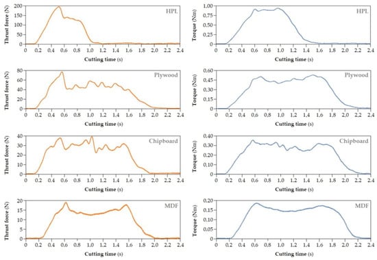 Waveforms of signals of the thrust force (left) and cutting torque (right) for the four processed materials; drilling process parameters: n = 3500 rpm and vf = 750 mm/min.