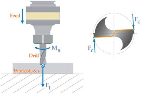 Using the cutting parameters shown in Table 3, drilling tests were performed on four workpiece materials. Figure 10 shows the distribution of forces occurring in the drilling process adopted in the research. In our case, there was only one force vector Fc resulting from the drill geometry shown in Figure 6a (one cutting edge).