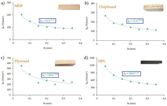 The procedure for determining the cutting resistance from Equation (21) was repeated for all the tested materials. In this case, it was possible to obtain the value of the unit cutting resistance kc1.1 and the exponent mc for each tested material. The charts and the parameters existing in Equation (9) are presented in Figure 12.