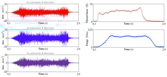 Analyzing the course of the thrust force Ft and cutting torque Ms recorded during the tests (Figure 9), it can be noticed that the signals contain characteristic fragments responsible for the entry and exit of the tool from the material, at which the signals increase or decrease accordingly.