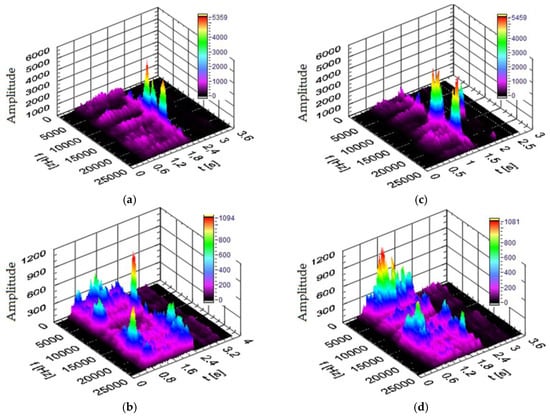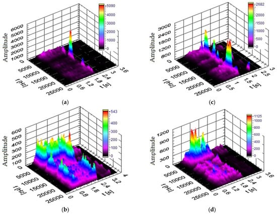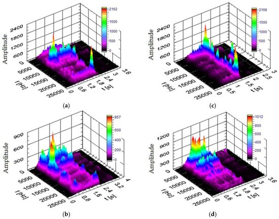 Spectrogram of the vibration signal in the X direction for (t—time, f—frequency) (a) plywood board, (b) HPL, (c) MDF and (d) chipboard.