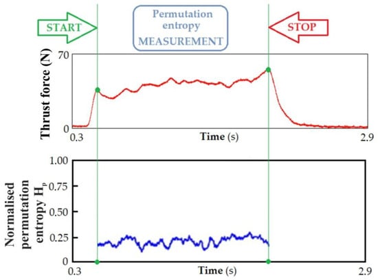 Figure 21 shows the thrust force signal and its PermEn Hp. The PermEn Hp values are low for materials with a homogeneous structure under normal cutting conditions because the force signal is similar to a regular periodic signal. However, the thrust force signals have different waveforms due to various effects, including different material density, hardness, and coefficients of friction in different positions. The Hp values changed within relatively small limits in the drilling processes of the materials tested. Table 6 shows the change in Hp values for the processed materials. The results show that the PermEn of thrust force signals can be applicable and indicate a material change in the drilling process.