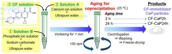 Finally, the supersaturated CaP solution was prepared by adding solution B (1 mL), followed by 2 mg/mL CF solution (1 mL), and lastly, solution A (2 mL) to a 15 mL centrifuge tube at 25 °C (Figure 1). Immediately after adding solution A, the final supersaturated CaP solution (4 mL) was vortexed for 1 min. Subsequently, the solution was aged under shaking at 150 rpm in a thermostatic shaker (M-BR-104P, TAITEC CORPORATION, Koshigaya, Japan) for 2 or 24 h at 25 °C to allow coprecipitation. The precipitate was collected by centrifugation (CN-1050, Hsiang Tai, New Taipei, Taiwan) at 6000 rpm for 5 min, followed by washing three times with ultrapure water. After washing, the product was resuspended in ultrapure water and freeze-dried for 24 h before further analysis. The resulting products were named CF-CaP2h and CF-CaP24h according to the aging times of 2 and 24 h, respectively.
