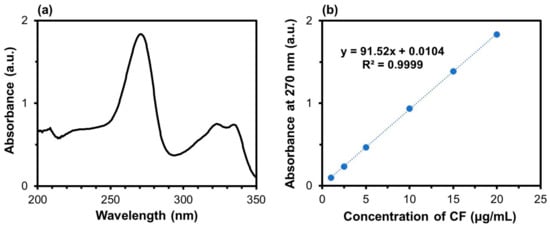 (a) UV absorption spectrum of the 20 μg/mL CF solution and (b) absorbance of the CF solutions with various concentrations at 270 nm.