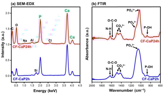 (a) SEM-EDX and (b) FTIR spectra of CF-CaP2h and CF-CaP24h. The peaks of Al and Si in (a) are from the sample holders.