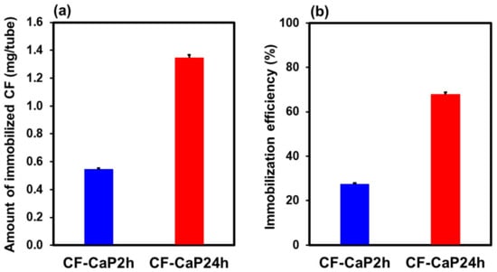 (a) Amount of immobilized CF and (b) immobilization efficiency of CF in CF-CaP2h and CF-CaP24h (n = 6, average + SD).