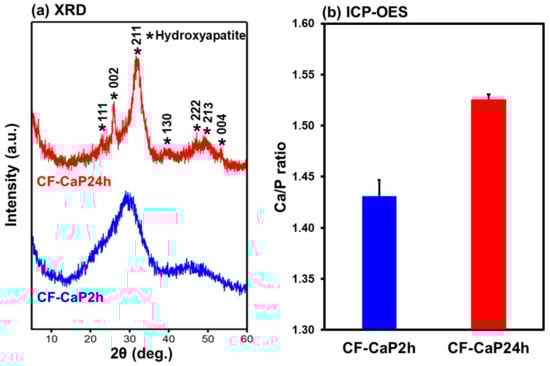 (a) XRD patterns and (b) Ca/P elemental ratios of CF-CaP2h and CF-CaP24h (n = 3, average + SD).