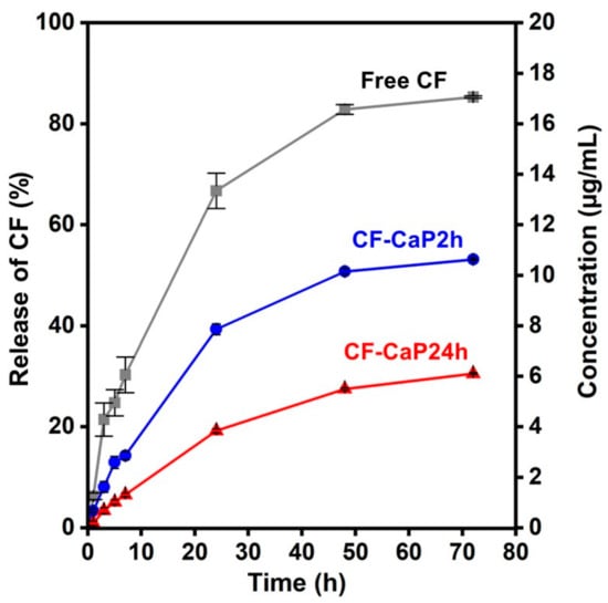 Despite the higher CF content, CF-CaP24h released CF in the physiological salt solution more slowly than CF-CaP2h. A major cause of this difference was the lower solubility of crystalline hydroxyapatite in CF-CaP24h than that of amorphous CaP in CF-CaP2h under the tested conditions, as reported previously [30]. This suggests that the CF release from these particles is associated with the partial dissolution of their CaP matrix. The difference in the specific surface areas of CF-CaP2h and CF-CaP24h, as observed by TEM (Figure 3c,d), might also be involved in their different CF-release profiles.