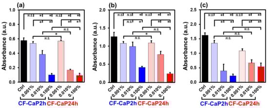 Relative number of living bacteria (absorbance at 450 nm) after the incubation of (a) S. mutans, (b) A. naeslundii, and (c) P. gingivalis in the presence of CF-CaP2h and CF-CaP24h at various concentrations: 0 (Ctrl), 0.001, 0.01, and 0.1 w/v% (n = 6, average + SD, * p < 0.05, N.S.: not significant).
