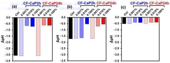 In the assay with S. mutans and A. naeslundii, the pH of the bacterial suspension decreased, which was alleviated by higher doses of CF-CaP2h and CF-CaP24h. Figure 9 shows the changes in the pH of the bacterial suspensions after 24 h incubation in the presence of various doses of CF-CaP2h and CF-CaP24h. The pH value of the S. mutans suspension decreased by 3.1 after incubation in the absence of the particles (Ctrl), whereas the decrease in pH was less than 0.8 in the presence of higher doses (0.01 and 0.1 w/v%) of CF-CaP2h and CF-CaP24h (Figure 9a). This indicated that these particles had an acid-neutralizing effect [40]. A similar effect was observed for A. naeslundii; the decrease in pH (1.7) of the A. naeslundii suspension during incubation was reduced to 0.5 in the presence of a higher dose (0.1 w/v%) of CF-CaP2h and CF-CaP24h (Figure 9b). At a medium dose (0.01 w/v%), only CF-CaP24h exerted an acid-neutralizing effect, and CF-CaP2h had no apparent effect on the pH of the bacterial suspension (A. naeslundii). For P. gingivalis, only a slight decrease in the pH of the bacterial suspension was observed, irrespective of the presence (at any concentration) or absence of the particles (Figure 9c).