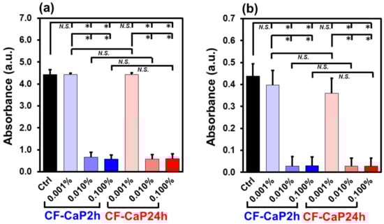 (a) Relative amounts of biofilms (absorbance at 595 nm) and (b) relative metabolic activity of the bacterial (S. mutans) biofilm (absorbance at 450 nm), after incubation of S. mutans in the presence of CF-CaP2h and CF-CaP24h at various doses: 0 (Ctrl), 0.001, 0.01, and 0.1 w/v% (n = 6, average + SD, * p < 0.05, N.S.: not significant).