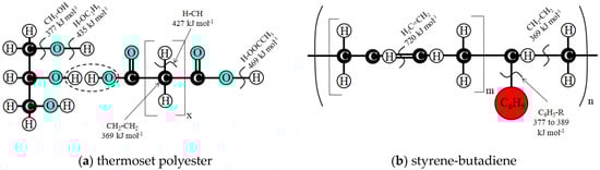 Depiction of HLEBI-activated: (a) thermoset polyester, and (b) styrene-butadiene co-polymer, respectively, adapted from Faudree et al. (2012) [], indicating approximate bond dissociation energies (BDE) [,] and DBs.