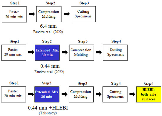 Figure 4 shows the fabrication steps for the three data sets, (a) 6.4 mm, (b) 0.44 mm, and (c) 0.44 mm + HLEBI. The commercial 6.4 mm and 0.44 mm samples were fabricated in three and four steps, respectively []. Figure 4 shows that the 0.44 mm + HLEBI samples were fabricated in five steps. Step 1 is mixing the paste for 20 min. Step 2 is 30 min of extended mixing. Step 3 is compression molding the paste into panels. Step 4 is cutting the samples. Finally, Step 5 is applying 0.86 MGy HLEBI to both sides of the samples (see the HLEBI Section).