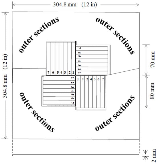 Figure 5 is an illustration of the SGFRP-BMC panels, showing specimens taken from the weak center section. During compression molding of the paste charge, the direction of flow is outward, but more random just below the plunger in the center. After molding, specimens (80 × 10 × 2 mm) were cut according to ASTM D 6110-02 (2002) [] for anisotropic panels []. Since this study focusses on improving impact strength at the weak panel center, samples cut from outer 3 sub-quadrants of each quadrant are not shown. Only the 4 sub-quadrants at center are shown, and are assumed to have identical flow patterns since they exhibited statistically lower impact strength than the outer sections [,,]. Locations of samples cut from the panel center are indicated in Figure 5. For consistency, specimens in each sub-quadrant are numbered from 1 to 7 outward from the center. The 14-sample data sets were taken from two sub-quadrants, two each from sample numbers 1 to 7.