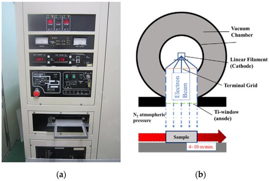 After molding and cutting, samples were treated with a HLEBI processor (Table 4) (Type LB250/15/180L, Energy Science, Inc., Woburn, MA, USA, Iwasaki Electric Group, Ltd., Tokyo, Japan), as shown in Figure 6a,b []. Faudree et al. (2022) gives a detailed explanation []. To estimate how far into sample thickness HLEBI activates, penetration depth, Dth (μm) is calculated. When ρ is sample density (g cm−3) and V is acceleration voltage at sample surface (kV), the Dth can be obtained []: