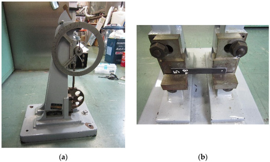 Charpy impact strength was measured using a drop-weight pendulum apparatus (Shimadzu Corp. No. 51735, Tokyo, Japan) [,] according to the JIS K 7077-1991 testing standard []. Figure 7a,b shows the impact tester and specimen mount. Specimen dimensions were 80 × 10 × 2 mm. Testing parameters and details can be found in Faudree et al. (2022) [].