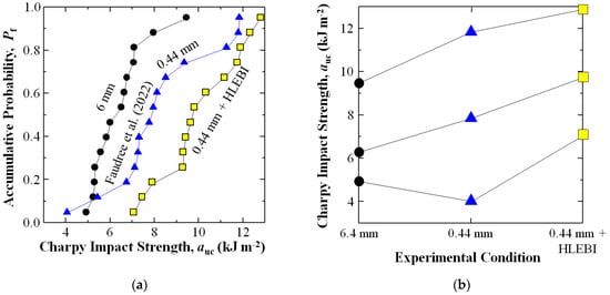 Experimental results showing: (a) changes in Charpy impact values auc (kJm−2) for SGFRP-BMC samples of untreated 6 mm and 0.44 mm, along with 0.44mm + HLEBI (0.86 MGy), with (b) the auc from (a) auc at low-, median-, and high-Pf of 0.049, 0.500, and 0.951, respectively. The 0.44 mm data are from Faudree et al. (2022) [].