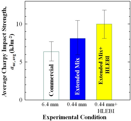 Average impact strength, auc, avg (kJm−2) with standard deviations (bars) for the three data sets: 6.4 mm, 0.44 mm, and 0.44 mm + HLEBI, respectively.