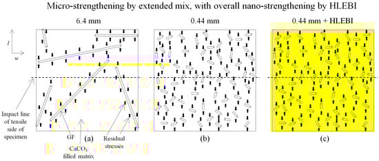 Figure 10a–c illustrates the micro-strengthening mechanism by an extended mix of the SGFRP-BMC for the 6.4 mm, 0.44 mm, and 0.4 mm + HLEBI specimens. The SGFs are depicted as having a random orientation as in the panel center. Impact strength enhancements are attributed to increase in Sf and Nf, as lf is shortened, acting to increase micro-compressive stress sites of the matrix on the SGFs by a difference in CTE during cooling down and shrinking [,]. The composite is hardened, increasing impact resistance. Figure 11b shows an order of magnitude increase in Sf and Nf over that of 6.4 mm (a) that is exceptionally more dispersed. Here, Nf is made to approximate the actual situation where a total length of 58 of 0.44 mm SGFs equals 4 of 6.4 mm SGFs. To discuss enhancement during impact, Figure 10 is made to depict tensile side of specimen with impact area across specimen width (dotted lines). Shortening SGFs to 0.44 mm allows for a higher proportion of SGFs to cross the line, along with increased compressive stress sites (arrows), to counter tensile deformation from impact for higher auc. On the other hand, in Figure 10a, the less dispersed 6.4 mm samples have gaps in the form of areas lacking SGFs with less residual stresses resulting in easier crack initiation and propagation in the matrix at the tensile side when impacted.