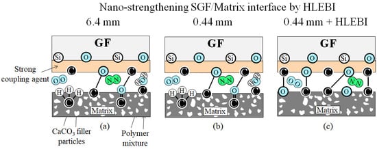 HLEBI has a positive track record of enhancing GFRPs with long fibers, GFs themselves, silica glass, and several types of polymers [,]. HLEBI is also reported to strengthen the fiber/matrix interface with electronic charge generation and the formation of DBs [].