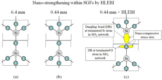 Figure 12a–c illustrates the strengthening within SGFs by HLEBI. HLEBI has been reported to strengthen silica glass []. Figure 12a,b shows the unactivated bonds in the SGFs of 6.4 mm and 0.44 mm samples. However, Figure 12c shows HLEBI activation creates DBs in the outer shell electrons at terminated O atoms in the SiO2 network in the 0.44 mm + HLEBI samples. The repulsion between lone pairs creates nano-compressive stresses that strengthen SGFs themselves to assist in raising the auc of the SGFRP-BMC system.