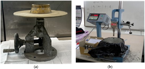 The flow test, conducted according to ASTM C 1437 standards [29], utilized a standard flow mold with open upper and lower diameters of 70 mm and 100 mm, respectively, and a height of 50 mm. The mold was centered on the flow table, and a 25 mm-thick first mortar layer was compacted 20 times. A second layer was then added until overflow, leveled, and the mold removed. The table was dropped 25 times within 15 s, and the diameter of the fresh mortar was measured along four guidelines, with the flow spread diameter calculated as their average. To determine the workability of the repair cement mortar, the setting time was measured according to the method provided in the literature. Figure 3 shows the apparatus used for performing the aforementioned tests.