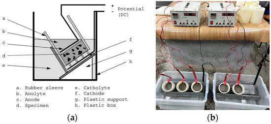 The chloride penetration test, conducted following NT-BUILD 492 [33], as shown in Figure 4, utilized cylindrical specimens with a height of 50 mm and a diameter of 100 mm. Before the experiment, specimens were immersed in a Ca(OH)2 solution for 18 h. Testing lasted 24 h under constant temperature and humidity conditions, applying 30 V and 0.46 mA for WWS specimens. Following the experiment, specimens were air-dried for 1 day and split hydraulically. Chlorine penetration length was determined by applying AgNO3 solution to the split surface, disregarding a 10 mm section on both sides to mitigate error. Measurements were averaged from seven lengths, spaced at 10 mm intervals on a smoother surface.