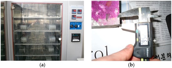 Specimens were cast following ISO 1920-12:2015 [34]. After 24 h of casting, 120 specimens were demolded for each concrete grade and cured at (20 ± 1) °C and (95 ± 5)% relative humidity for 28 d. Subsequently, specimens were dried at 60 °C for 48 h and placed in an environmental simulation test chamber for a week to equilibrate temperature and humidity with the external environment as shown in Figure 5a,b. To accelerate carbonation testing, a high CO2 concentration was applied, accelerating the carbonation method. The environmental simulation test system provided conditions for carbonation testing. Carbonation depth was assessed using 1% phenolphthalein reagent in 95% ethyl alcohol. Ten points on the specimen’s cross-section were measured for carbonation depth, with an accuracy of 0.1 mm, and their average value was determined.