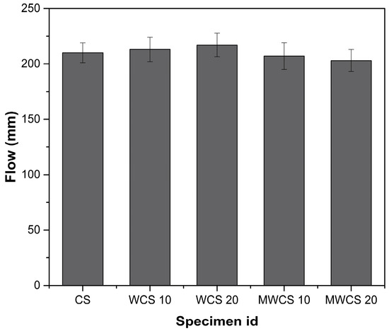 The impact of both treated and untreated wheel wash sludge (WWS) on the workability of WCS and M-WCS was evaluated through the slump test, as depicted in Figure 7. The results indicate a consistent enhancement in a slump with an increase in WWS content. Compared to the CS, WCS exhibits a slump increase of 2.4% and 4.3% for cement substitution levels of 10% and 20%, respectively. Conversely, for M-WCS, the slump slightly decreases by 1.2% and 2.6% for the same cement substitution levels. This variation in trend is attributed to the higher particle size distribution in M-WCS, as shown in the previous studies. Ball milling is attributed to a smoother surface and higher water absorption, which increases the friction between the aggregate particles and consequently restricts the flow of fresh concrete [37,38]. In addition, it impedes the steric repulsion effect of the superplasticizer. In contrast, WCS enhances workability due to its greater paste volume, which results from its lower specific gravity compared to CS. The increased paste volume contributes to additional lubrication effects in fresh concrete, reducing the energy required for compaction or flow enhancement [39,40].