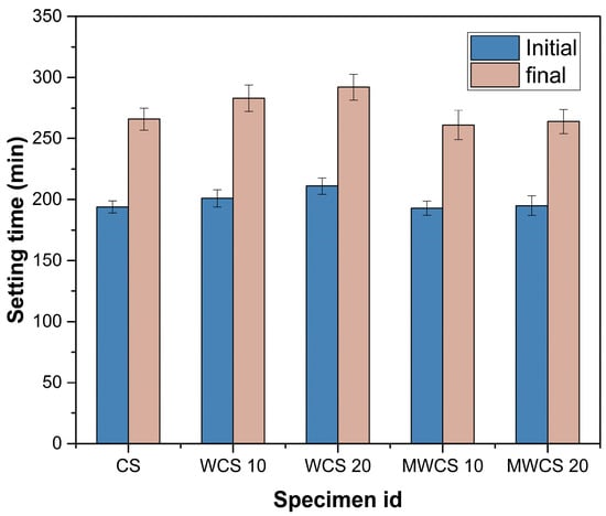 The results depicted in Figure 8 demonstrate that the substitution of cement with WCS significantly delays both initial and final setting times, with the setting time prolonging at higher levels of cement substitution. Notably, Figure 8 illustrates both linear and non-linear relationships between setting time and WCS cement substitution. This extension in setting time may be attributed to the reduced rate of ettringite production resulting from gypsum reaction with water, as well as the hydration reaction generating a skeletal framework (C-S-H) from the reactions of alite (C3S) and belite (C2S). These findings align with previous research [41] on High-Strength Concrete (HSC), which incorporates various supplementary cementitious materials. Furthermore, the delay in setting time may be attributed to the decrease in portlandite generation from hydration reactions with increasing cement content, while the rate of subsequent pozzolanic reactions remains constant. Conversely, Modified Waste Ceramic Slurry (M-WCS) exhibited a slight reduction in setting time.