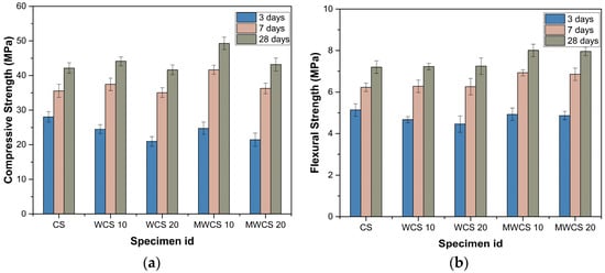 The compressive strength characteristics of WWS before and after pretreatment were analyzed through a series of compressive strength tests in this experimental study. Figure 9a presents the results of these tests for samples containing WWS. For the general repair material, compressive strength reached 28.06 MPa after 3 days, increasing to 35.57 MPa and 42.17 MPa after 7 and 28 days, respectively. Samples containing 10% WCS without pretreatment exhibited strengths of 24.51 MPa after 3 days, 37.45 MPa after 7 days, and 44.11 MPa after 28 days. The 20% WCS sample showed 20.94 MPa after 3 days, 35.06 MPa after 7 days, and 41.66 MPa after 28 days, indicating a slight improvement in strength compared to the general sample. Samples treated with M-WCS displayed enhanced strength, with the 10% M-WWS sample achieving 24.74 MPa after 3 days, 41.66 MPa after 7 days, and 49.28 MPa after 28 days, representing over a 15% improvement compared to the general sample. The 20% M-WCS sample showed 21.46 MPa after 3 days, 36.27 MPa after 7 days, and 43.19 MPa after 28 days, indicating a 3% improvement compared to the control sample. At 7 days, the addition of WCS was more effective in increasing the compressive strength of the specimen. According to [1,42], construction sludge concrete also exhibited greater strength than control specimens at the same levels of cement substitution at the early ages. The high efficiency of WCS in its early stages may be attributed to its chemical composition, which had a higher concentration of CaO and a lower concentration of SiO2 compared to the reference specimen. The presence of CaO in WWS facilitates a quick chemical reaction with water, resulting in the development of strength during the initial stages of the curing process. Furthermore, CaO is essential in promoting the formation of compressive strength in concrete during the initial stages of the curing process [43]. After 28 days, there was an 11% improvement compared to the untreated 10% sample. The increase in strength is attributed to pozzolanic reactions involving portlandite (Ca(OH)2) and silica (SiO2) compositions of WWS, resulting in the formation of secondary hydration products (C-S-H) at an accelerated rate [44,45].