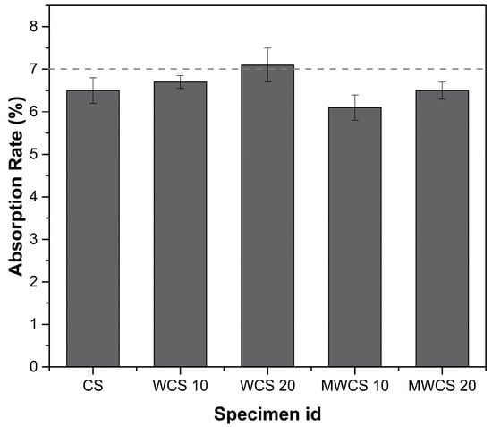 After 28 days of curing, the water absorption test was conducted on mortar specimens, and the results are presented in Figure 10. The test revealed that the water absorption rate for the control specimen (CS) was 6.5%, while for the specimen with 10% WCS, it was slightly higher at 6.7%, albeit still within acceptable limits indicated by the dotted line on the diagram. However, for specimens containing 20% WCS, the absorption rate was relatively higher at 7.1%. Conversely, Modified Waste Ceramic Slurry (M-WCS) specimens exhibited absorption rates of 6.1% and 6.5% for 10% and 20% substitution levels, respectively, compared to the control specimen. The milling process of M-WCS facilitates a higher surface area for pozzolanic reactions, leading to the formation of additional cementitious compounds over time and resulting in a denser matrix [46,47]. Consequently, the absorption rate was reduced by approximately 6%. In previous studies, a similar trend was observed in the increase in water absorption in WCS-10 and WCS 20, suggesting that beyond the optimal cement replacement, non-treated WWS significantly increases the porosity of repair mortar. In general, the reduction of porosity is accomplished by effectively filling the gaps between bigger particles with smaller particles, as observed in the M-WCS specimen. When there are more smaller particles than needed to fill the gaps, the extra smaller particles might push the larger particles apart, generating bigger empty spaces that let more water in. The moisture content of concrete naturally varies due to the addition of water during the mixing process. However, the process of cement hydration, which involves the drying of mortar and the formation of gaps between particles, leads to increased water absorption, particularly in dried mortar [39,48]. Hence, it was concluded that the use of WWS as a repair material after pretreatment is suitable.