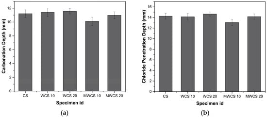 Figure 11a,b depict the carbonation depth and chloride penetration depth, respectively. For the control specimen (CS), the carbonation depth was measured at 11.21 mm. Notably, specimens containing 10% and 20% WCS exhibited higher carbonation depths, with increments of 1.7% and 3.2%, respectively. Conversely, M-WCS specimens with 10% and 20% content showed marginal decrements in carbonation depth, with reductions of 9.8% and 2.5%, respectively, indicating higher resistance compared to the general sample. This resistance is attributed to the addition of finer SCMs, which improve packing density and reduce porosity. Moreover, higher incorporation of M-WCS leads to increased formation of calcium silicate hydrate (CSH) products, inhibiting carbonation movements. Therefore, it is recommended that WWS be used after pretreatment for enhanced durability.
