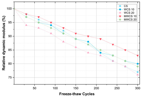 After exposure to 300 cycles, the dynamic modulus of elasticity of the specimen containing 10% M-WCS decreased by only 14%. In contrast, specimens containing 20% WCS and M-WCS exhibited decreases of approximately 24.3% and 22.3%, respectively, compared to the control mix, which experienced a 40% decrease after exposure to 280 cycles, marking the end of the test according to ASTM C666 [35]. Unlike the above test results, in this case, the WCS specimens showed a better performance than M-WCS. This is because freezing and thawing resistance is determined using entrained air and the strength of the cement matrix rather than the packing (filler) effect and contribution of the pozzolanic reaction [37].