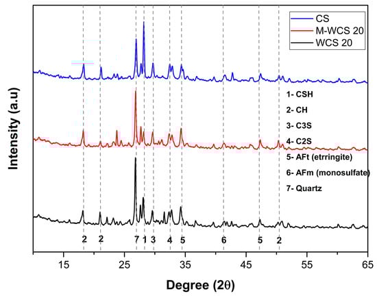 The crystallographic structure of both the cement mortar and conductive mortar was analyzed through X-ray diffraction (XRD) using a Goniometer Ultima+ instrument from Mitsubishi Tanabe Pharma, Osaka, Japan. XRD measurements were performed with a wavelength of 1.54 Å, scanning within a 2θ range of 10–65°, at a speed of 2°/min, and with an applied voltage of 40 kV at 30 mA. The compositional and morphological characteristics of the WWS and its distribution throughout the matrix were observed using SEM, as performed in previous studies [36].