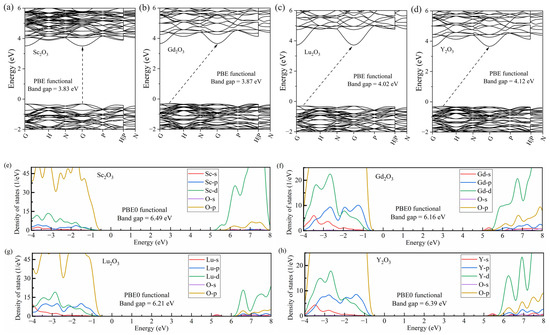 The PBE calculated band structure (a–d) and the PBE0 calculated DOSs (e–h) of a series of M2O3 (M = Sc, Gd, Lu and Y), respectively.