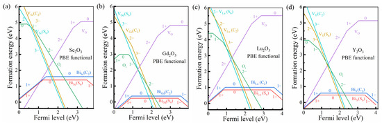 As shown in Figure 3, the formation energy calculations were performed for studying the properties of the intrinsic and Bi-doped defects in M2O3 (M = Sc, Y, Gd and Lu), including the intrinsic defects of cation vacancies at the C2 and S6 sites, e.g., VM(C2) and VM(S6), oxygen vacancies (VO) and oxygen interstitial defects (Oi), as well as those of bismuth ions substituting the C2 and S6 cation sites.