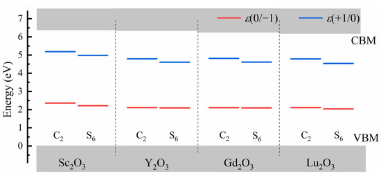 In Figure 4, the thermodynamic charge transition levels ε(+1/0) and ε(0/−1) of Bi dopants were plotted to investigate the trap properties of M2O3:Bi3+ in the four M2O3 states (M = Sc, Y, Gd and Lu).