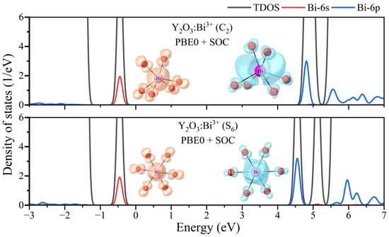 The PBE0+SOC calculated partial DOSs of 6s and 6p orbitals of Bi3+ dopants in the two cation sites for the ground state of Y2O3:Bi3+, and the corresponding charge density distribution profiles.