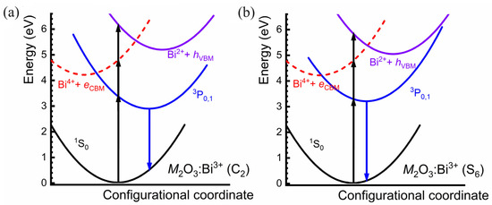 As listed in Table 1, there are slight differences (~0.3 eV) between the excitation energies of Bi3+ dopants being at the C2 and S6 sites, including the A band, CT and MMCT transitions. However, the emission properties of the A band transition are quite different for Bi3+ dopants at the two cation sites. In both of the experimental and calculation results, the Bi3+ dopants at C2 sites exhibit a large Stokes shift in the range of 1.2–1.4 eV, while such values are remarkably smaller (at around 0.3 eV) for the Bi3+ dopants at S6 sites. There were arguments that the main double-peaked green emission band centered around 3.7 eV should correspond to the crystal-field splitting of the low-excited levels in the low-symmetry C2 luminescent center [28]. However, the energy positions of the lowest Bi3+ 6p levels show slight differences between the two sites, as plotted in Figure 5. And the geometric relaxation difference in the 3P0,1 excited state results in a remarkably different Stokes shift at the two sites according to our calculations. Based on the relaxed equilibrium structures of the ground state and various excited states of Y2O3:Bi3+, a schematic configuration coordinate diagram (Figure 6) is constructed to show all the excited states, illustrating the luminescence process. For the M2O3:Bi3+ series, the potential energy surface of the Bi4+ + eCBM state intersects with that of (Bi3+) 3P0,1, and non-radiative relaxation from the former to the latter can be bridged with the cooperation of phonons.