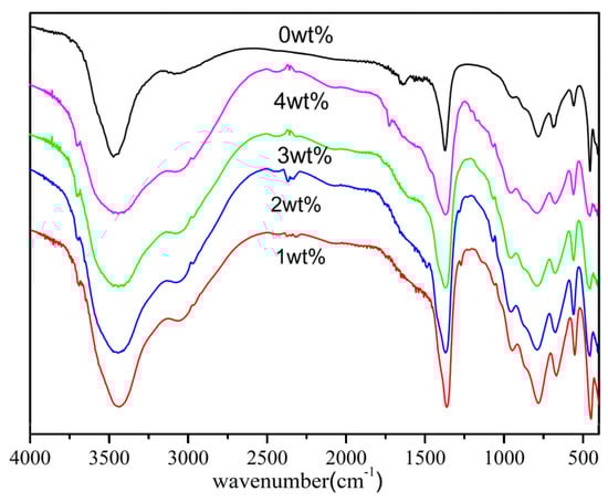 Figure 3 presents the FT-IR spectroscopic data for LDHs synthesized with different concentrations of MTS, arranged from highest to lowest (0, 4, 3, 2, 1 wt%). In the spectrum of the unmodified LDH, bands associated with hydroxyl groups (-OH) are observed at 3466 cm−1, corresponding to water molecules, and at 3073 cm−1, which is indicative of a bridge bond between water and anions. Additionally, a bending vibration mode related to water is detected at around 1636 cm−1. A distinct peak at approximately 1350 cm−1 is attributed to the asymmetric stretching vibration of the carbonate ion (CO32−), whereas the band at 827 cm−1 is associated with the v2 vibrational mode of CO32− ions located within the intercalated spaces of the LDH layers []. The presence of bands at 576 cm−1 is indicative of the metal–oxygen (M–O) stretching vibration, where M represents magnesium (Mg2+) or aluminum (Al3+) ions. The FT-IR spectra of the MTS-modified LDHs closely resemble those of the original LDH, indicating that the structural integrity of the LDH framework was preserved despite the modification process, a finding that is consistent with XRD results. Furthermore, an additional albeit weak band appears at about 1060 cm−1 in the spectra of LDHs treated with MTS, which is characteristic of the Si-O-Si vibrational mode unique to MTS. The FT-IR spectra provide clear evidence of the successful functionalization of LDHs with MTS.