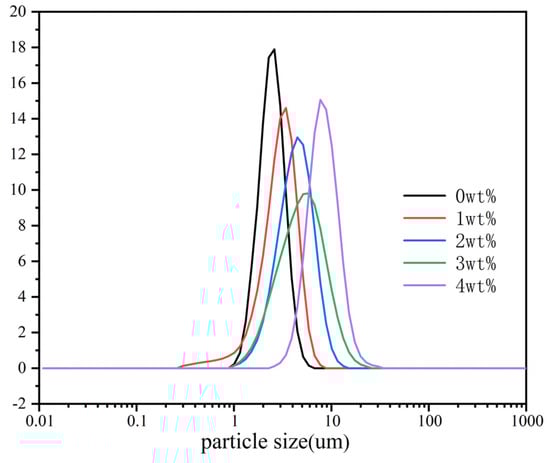 Particle size distribution curves of LDHs prepared with different amounts of MTS (from left to right: 0, 1, 2, 3, 4 wt%).