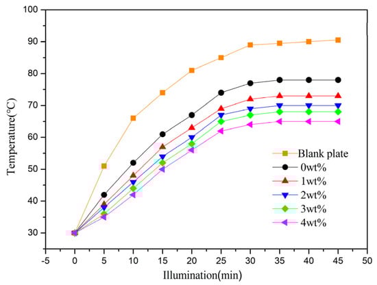 The thermal insulation properties of LDH-coated films were assessed using a custom-built testing device, illustrated in Figure 7. The tests began at room temperature and continued until equilibrium temperatures (Teq, defined as minimal temperature fluctuations (<1 °C) over a 5 min period) were achieved. All tests were conducted under consistent lighting conditions, starting from an initial temperature of 30 °C []. Temperature fluctuations were monitored at the rear surface of cement reference panels coated with thermal insulation films, with an LDH-free coating serving as the control. Without thermal insulation coatings, the blank panel temperature swiftly rose under iodine–tungsten light, reaching a Teq value of 89.4 °C in about 30 min. Conversely, panels coated with LDH-based thermal insulation films displayed reduced back surface temperatures, indicating superior thermal insulation. Notably, Teq values decreased with increasing MTS content. Among the LDH-coated films, the 4 wt% MTS-modified LDH coating exhibited the best thermal insulation performance, with a Teq value of approximately 61 °C and a slower temperature increase rate. These findings underscore the efficacy of MTS-modified LDH fillers for thermal insulation applications.