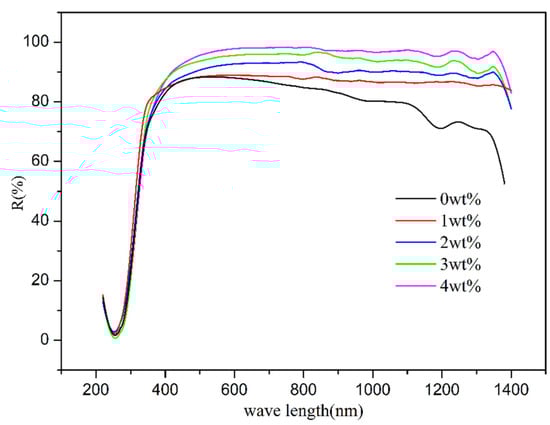 The widespread use of heating and cooling systems in high-energy-consuming global constructions leads to increased energy wastage. However, applying water-based thermal insulation coatings on surfaces can effectively provide cooling and heat-insulating effects []. This type of coating uses water as a dispersion medium, making it eco-friendly and non-toxic, which helps achieve energy conservation and emission reduction goals. Thermal insulation coatings are typically categorized into barrier, reflective, radiation, and composite types based on their heat insulation mechanisms. Reflective coatings in particular can impede heat conduction by relying on the surface reflectivity of the coating, which are fabricated using a variety of materials and are applied to solar cells, modules, and other contemporary applications [,,,,,]. Various factors influence the reflectivity of the coating, such as the ratio between the filler refractive coefficient and the coating resin matrix, coating film thickness, particle size, and distribution of the filler [,,].