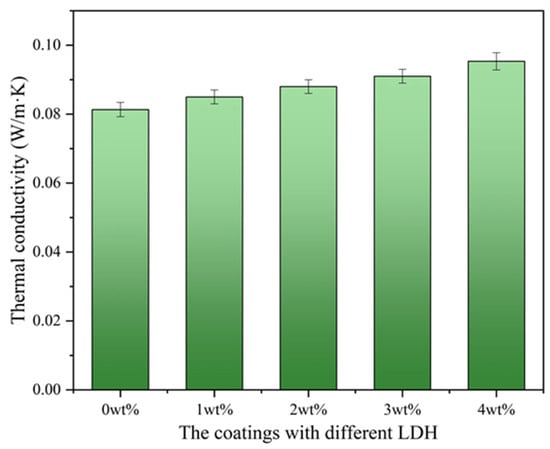 Thermal conductivity is a critical parameter when evaluating the thermal insulation properties of a material. It measures the ability of a material to conduct heat, indicating how effectively it can resist the transfer of thermal energy. Materials with low thermal conductivity are excellent insulators, as they impede the flow of heat, helping to maintain consistent temperatures and reduce energy consumption [,]. Against this background, the thermal conductivity of the coatings containing different LDHs prepared with different amounts of MTS (from left to right: 0, 1, 2, 3, 4 wt%) was also investigated here (Figure 9). The thermal conductivity of the coatings rises as the MTS content increases in the LDH preparation process. This trend is likely attributed to the cross-linking and stacking between LDH flake layers, along with an increase in particle size, which diminishes porosity between fillers and boosts filler density, subsequently elevating thermal conductivity [,]. Nonetheless, the variation in the thermal conductivity of hydrotalcite with diverse particle sizes is minimal, possibly because the layer spacing of hydrotalcite remains largely unchanged pre- and post-modification. Consequently, based on the thermal insulation effect, it can be deduced that thermal conductivity is not the primary factor influencing thermal insulation, and the low thermal conductivity of hydrotalcite makes it a promising filler for thermal insulation materials.